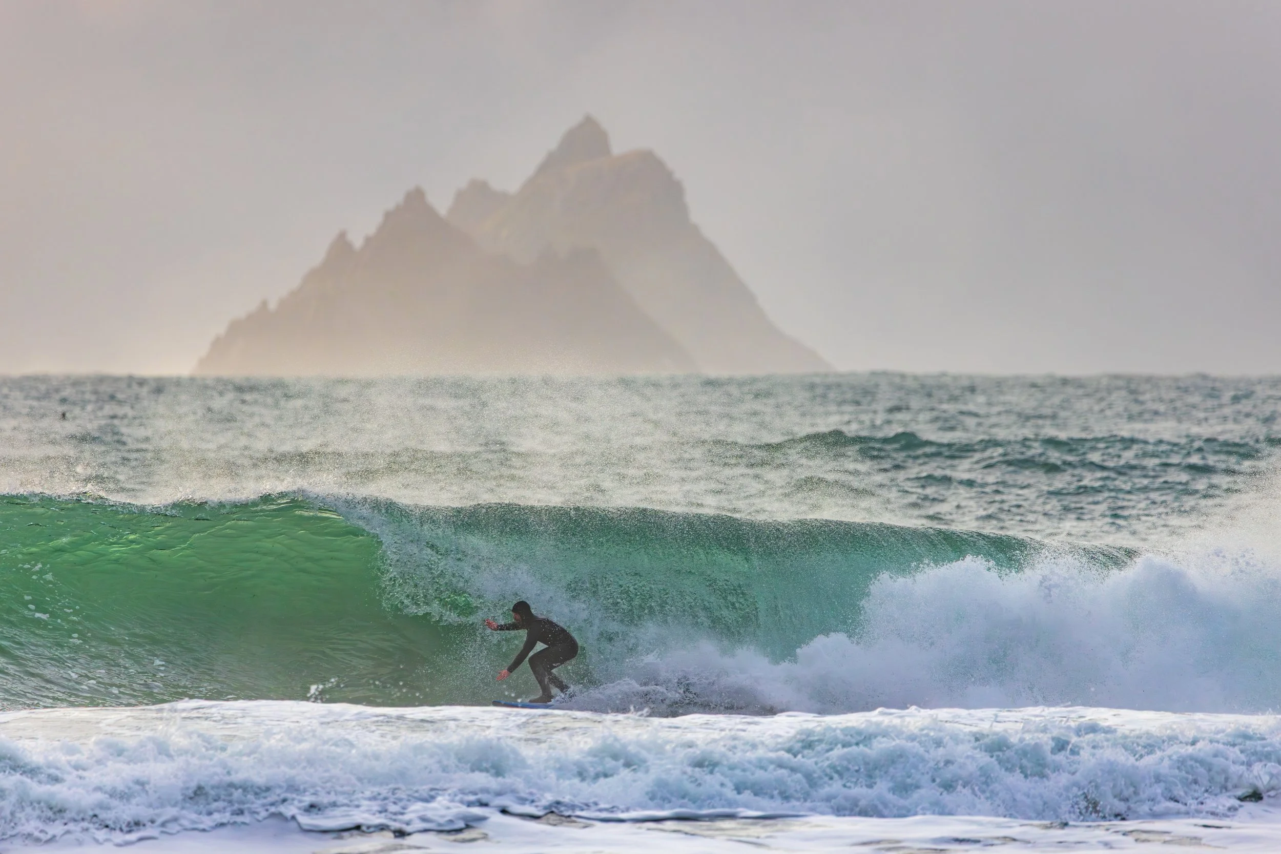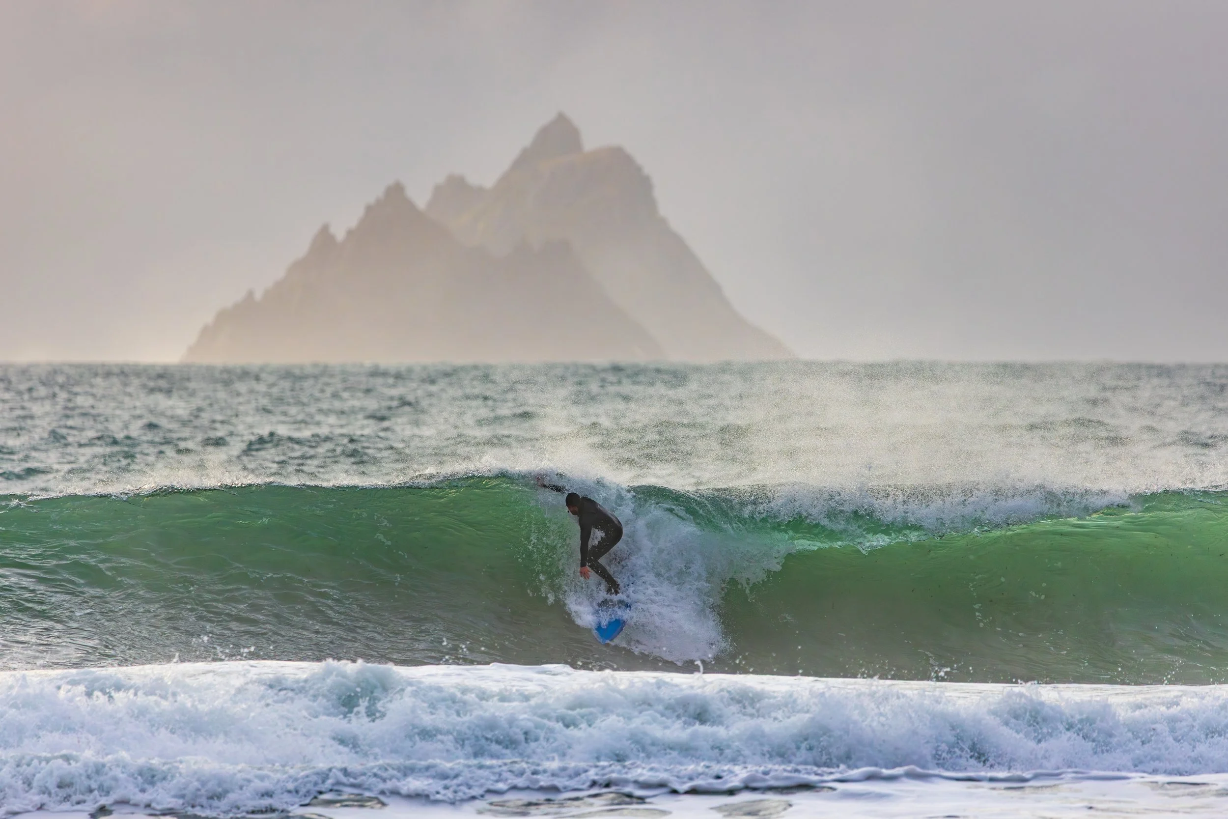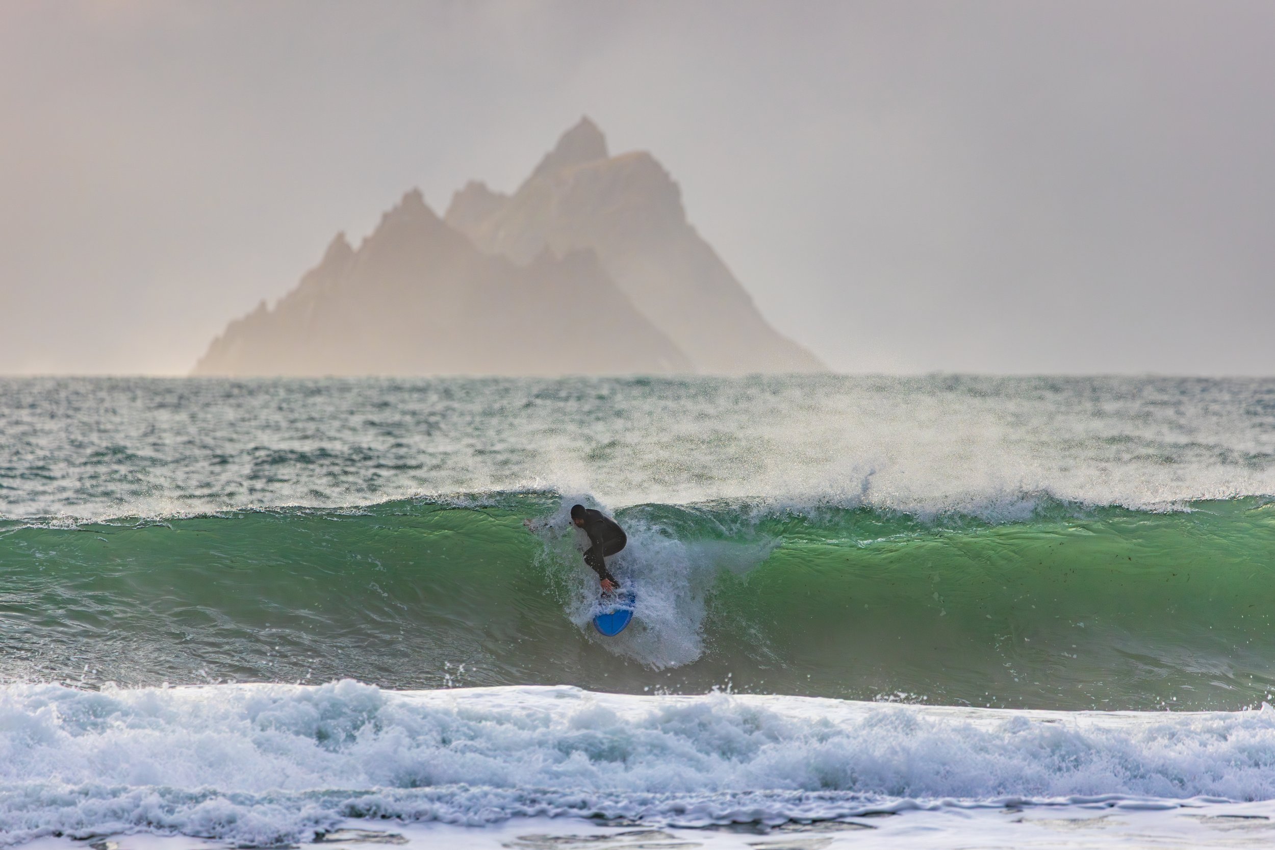 The difficulty was alignment. At 600mm, tiny shifts matter. A surfer lifted by a wave can move out of position against the Skelligs instantly. We waited. We tracked. We missed a few. Then one wave built differently.