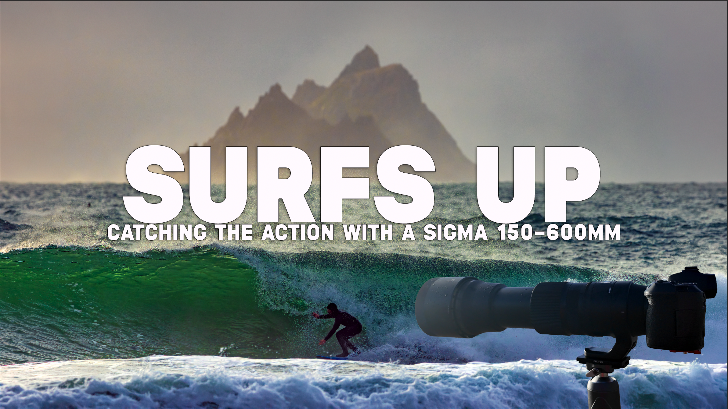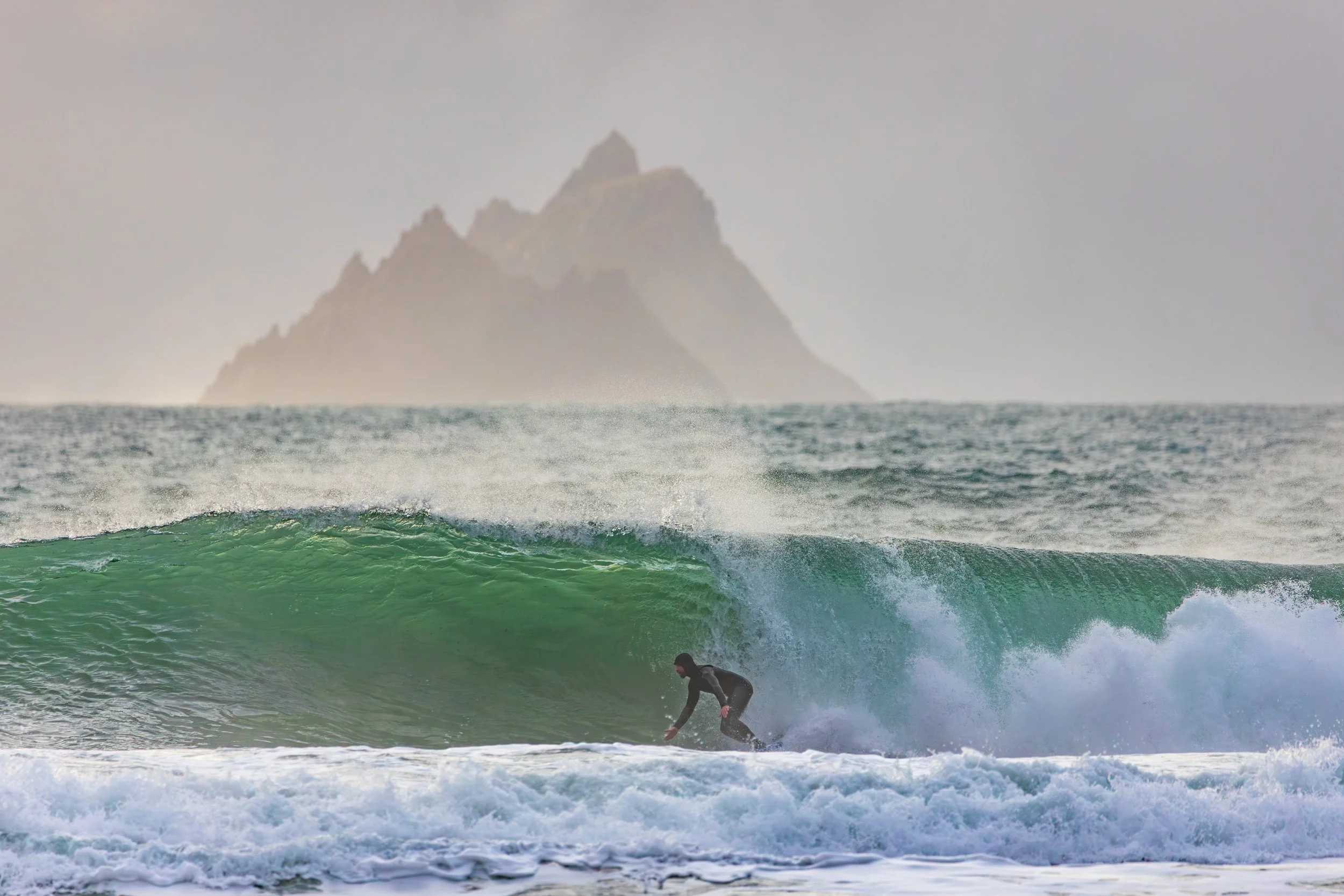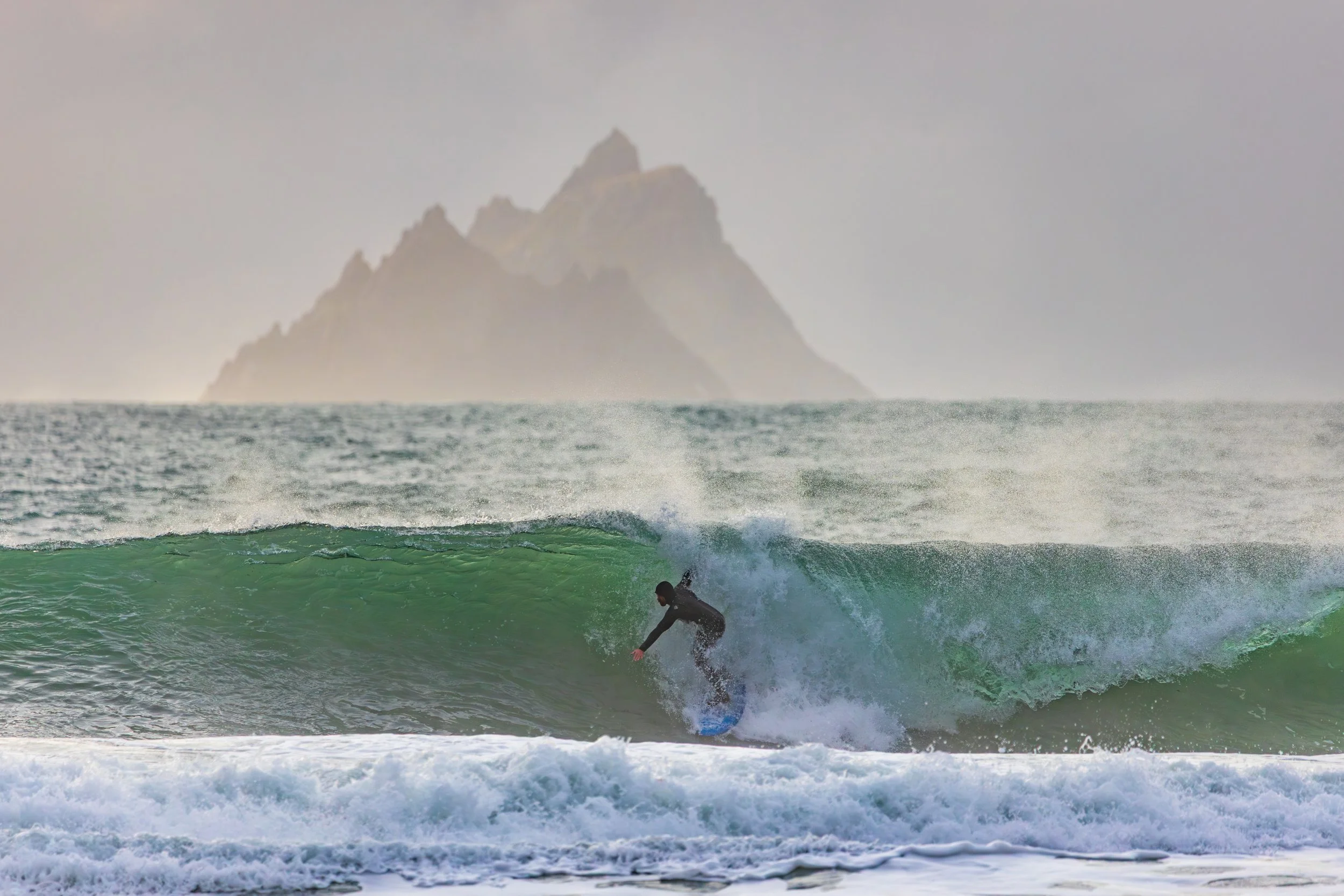 The difficulty was alignment. At 600mm, tiny shifts matter. A surfer lifted by a wave can move out of position against the Skelligs instantly. We waited. We tracked. We missed a few. Then one wave built differently.